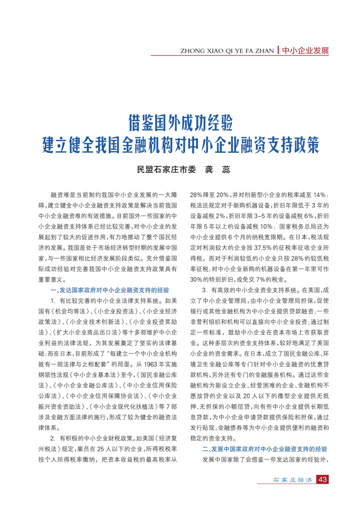 《石家庄经济2014-6》P43-44 借鉴国外成功经验 建立健全我国金融机构对中小企业融资支持政策